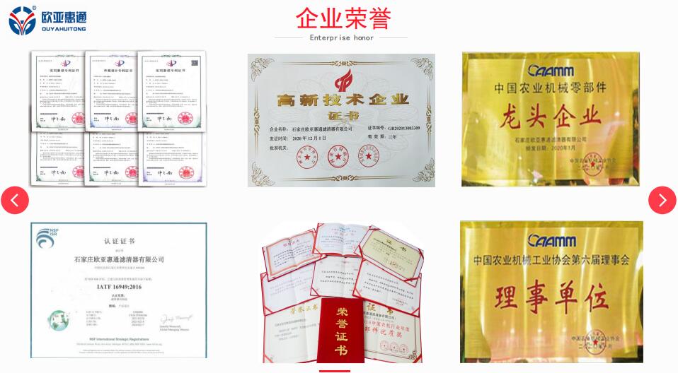 石家莊歐亞惠通濾清器有限公司是一家致力于濾清器研究和生產的企業,產品廣泛應用于農用機械、工程機械等領域,是集開發、設計、生產、銷售于一體并擁有自主進出口權的公司,公司技術實力雄厚,已有多項產品設計榮獲國家專利,公司為國家認定的高新技術企業,通過IATF16949國際質量管理體系認證。
