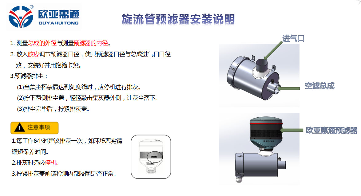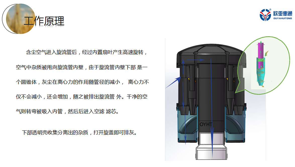 含塵空氣進入旋流管后,經過內置扇葉產生高速旋轉,空氣中雜質被甩向旋流管內壁,由于旋流管內壁下部是一個圓錐體,灰塵在離心力的作用隨管徑的減小,離心力不僅不會減小,還會增加,隨之被排出旋流管外。干凈的空氣則轉彎被吸入內管,然后后進入空濾濾芯。下部透明殼收集分離出的雜質,打開旋蓋即可排灰。